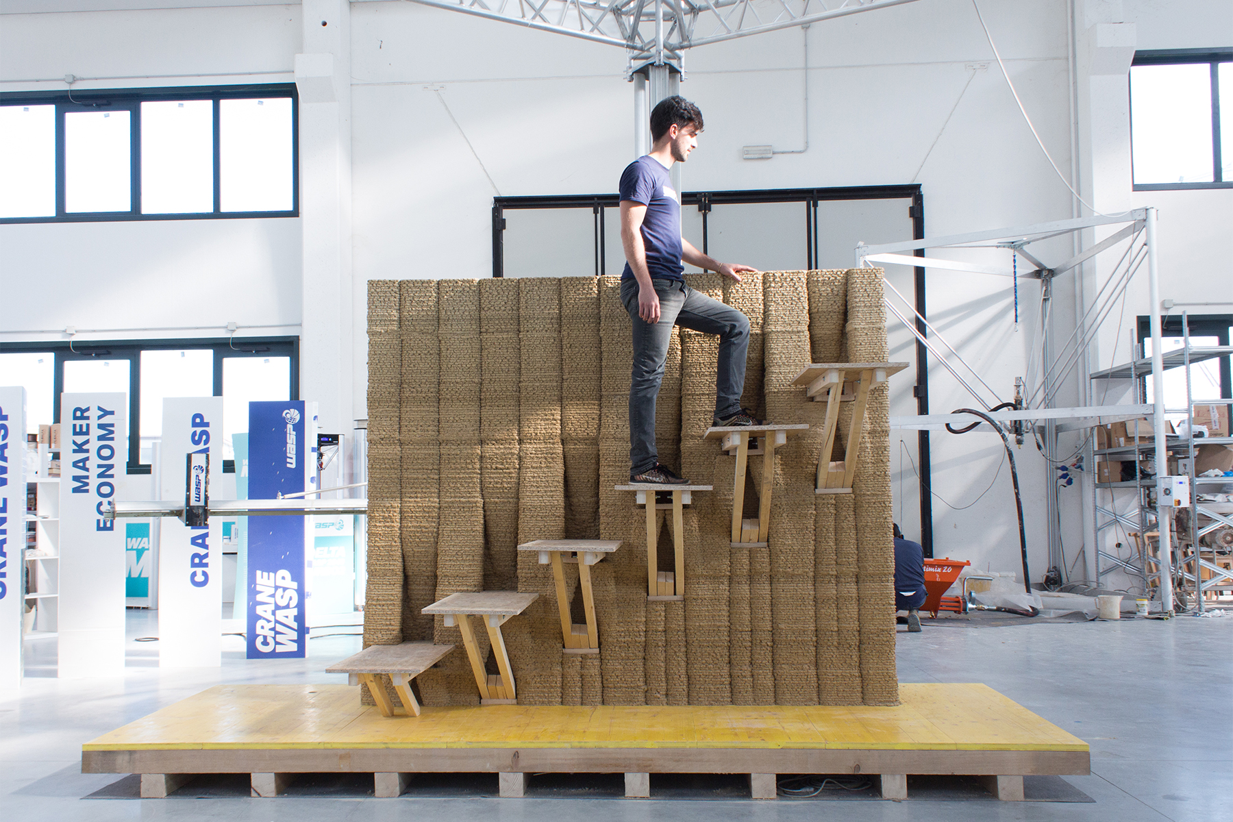 After all the tests and prototypes at different scale, OTF students could shift to the 1:1 scale model in collaboration with WASP in Italy. There they worked with the km-0 material available which was the Rice house material they used for their GAIA project.