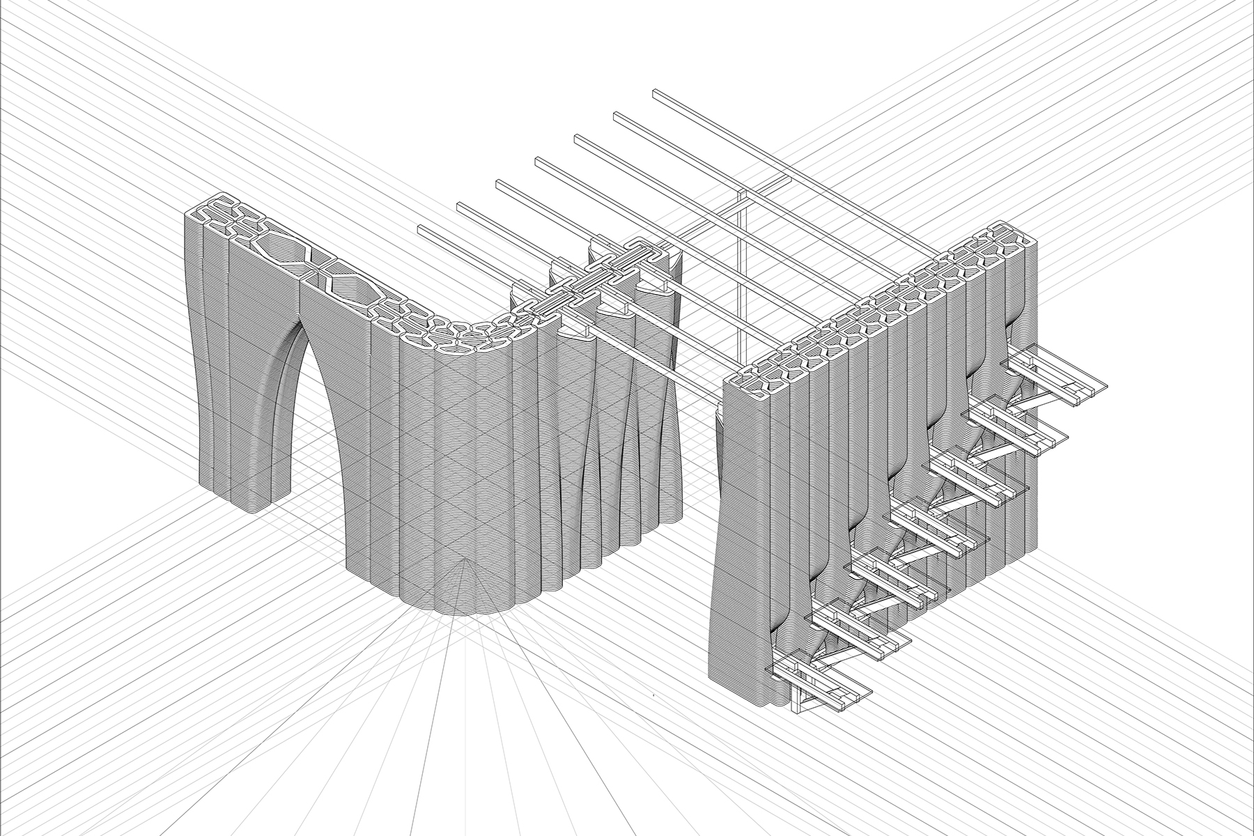 Inspired from the endless house, OTF students rethought our current building system by selecting several connection elements, such as arch opening, staircase, and integrating them into a continuous surface – created with space in one go.