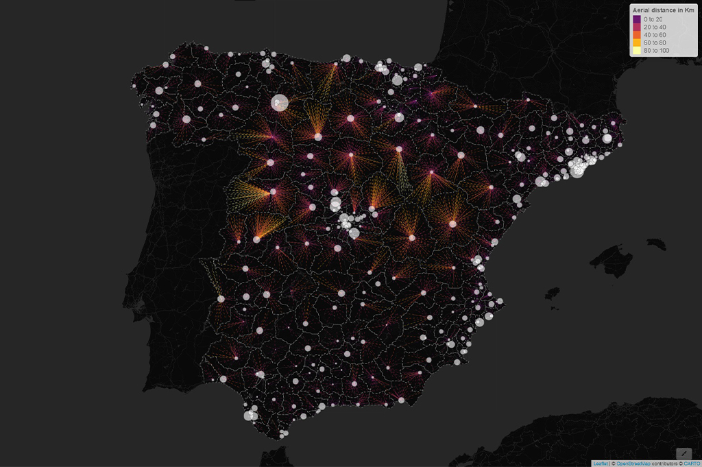 The map reports the location of the Spanish healthcare nodes with their hosting capacity and reachability in their surrounding territory. Starting from the hospitals and based on the road infrastructure plus the terrain morphology, a cumulative cost analysis is conducted in order to visualize their degree of accessibility. This map highlights the geolocalized unbalances of the national healthcare system and functions as a base to draw the hospital catchment areas.