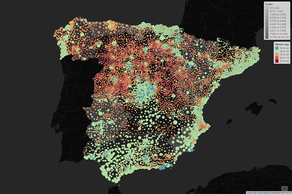 The map reports the number of COVID-19 cases per region. Moreover, a dot map highlights the municipalities at a higher risk in consideration to the total population (the radius of the circles) and the median age ( from brighter to darker).