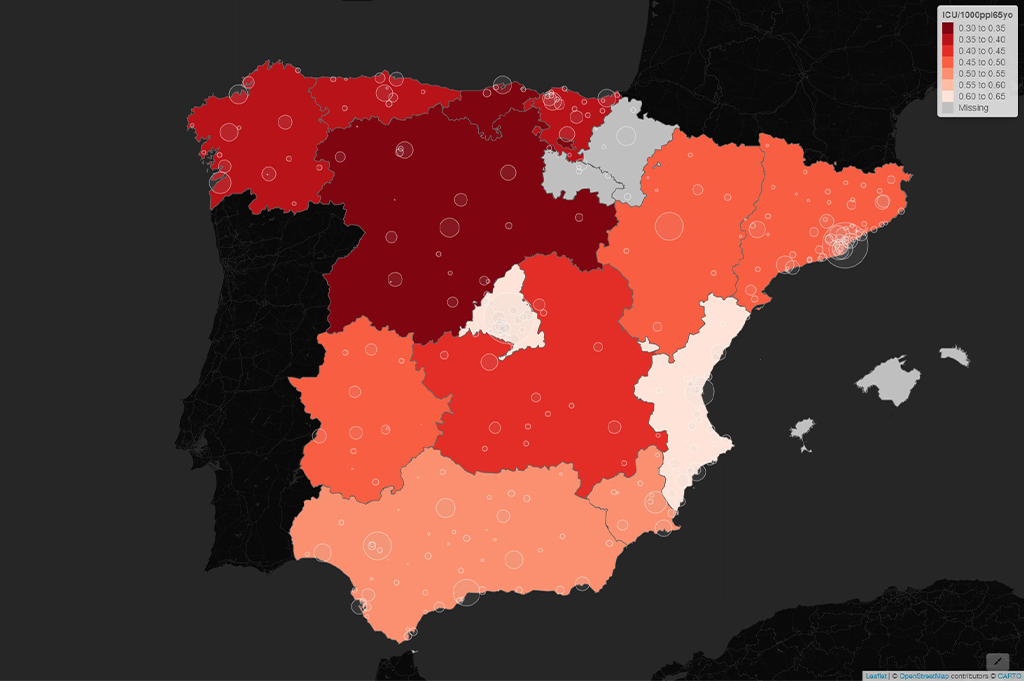 The map reports the location of the Spanish healthcare nodes with their relative availability of beds and ICUs in relation to the number of citizens they serve by proximity. The radius of the circles is representative of the number of beds in the hospital per 1000persons, while the color shows the availability of ICUs. The latter is mapped from regional data.
