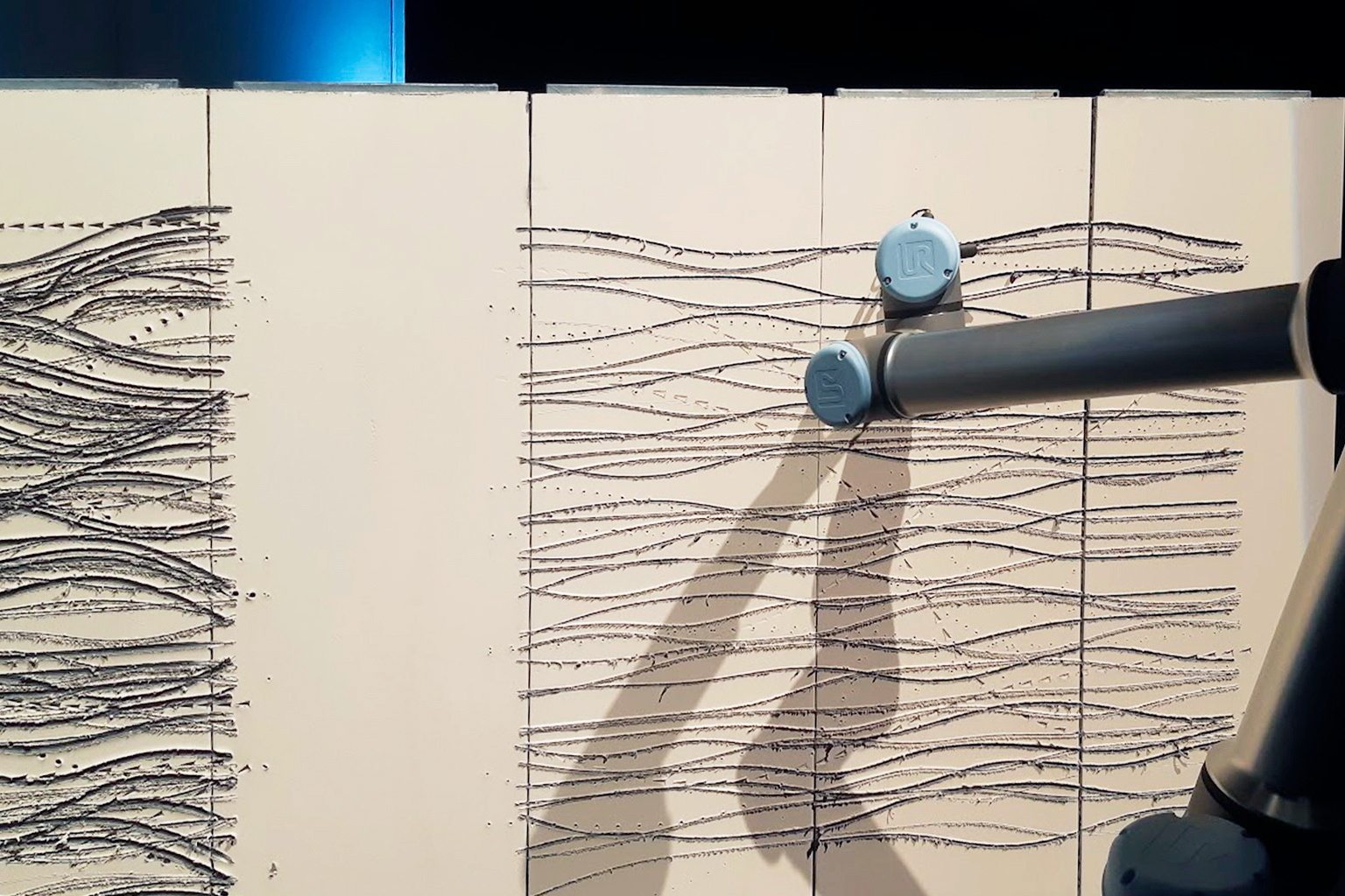 This entails a high-level technology challenge that IAAC solved connecting technology across different disciplines and developing custom algorithms and pipelines. In particular, the project explored the connection between a FFT sound analysis (“Fast Fourier Transform”), an artistic programming system (VVVV), a computational drawing system (Grasshopper 3D), a robotic control system (ROS) and a couple of 6-axis collaborative industrial robots (UR).